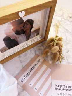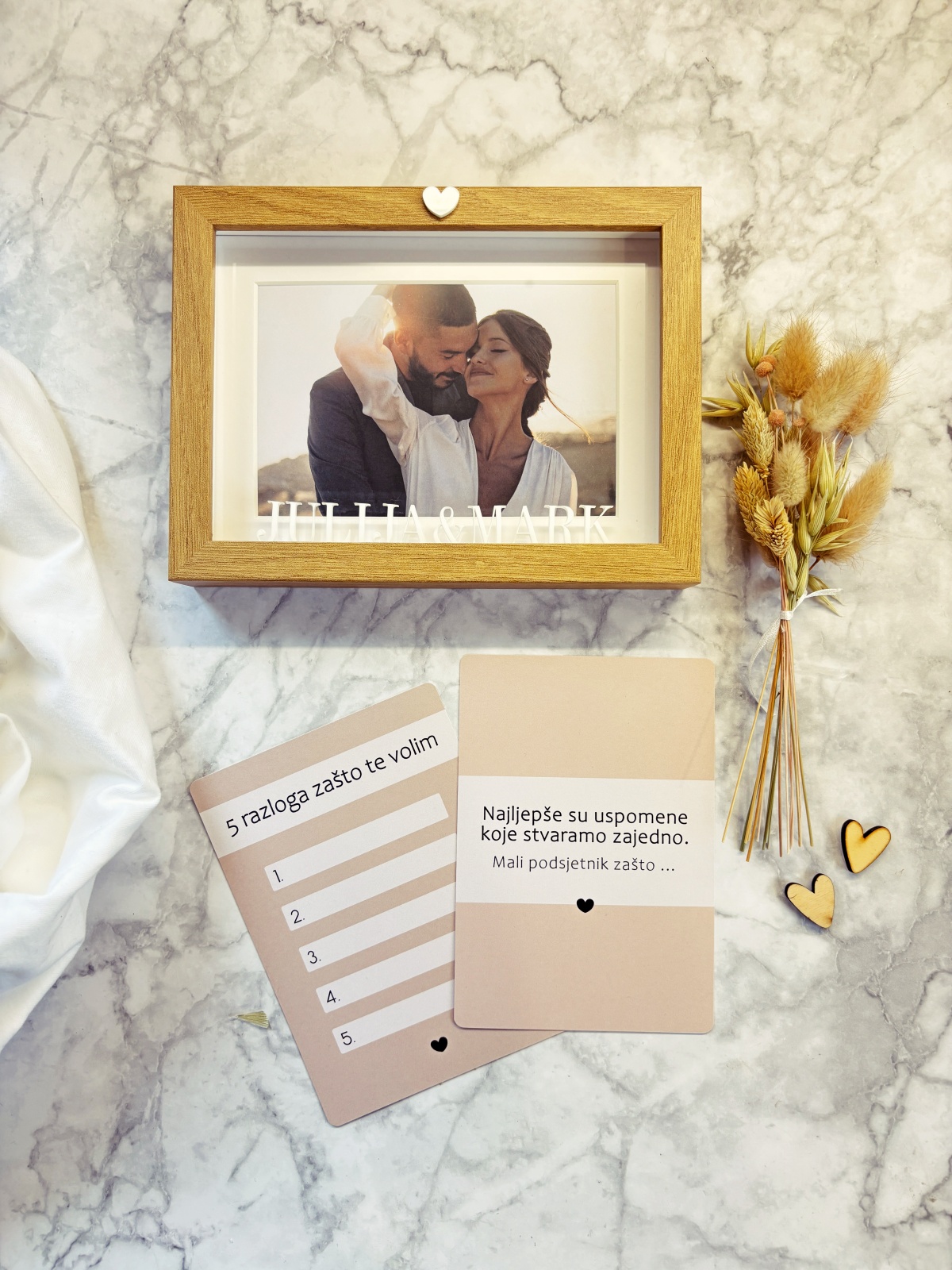 Personalizirani okvir s fotografijom, poklon-kartica s porukom i suho cvijeće čine ovaj paket posebnim i emotivnim darilom.