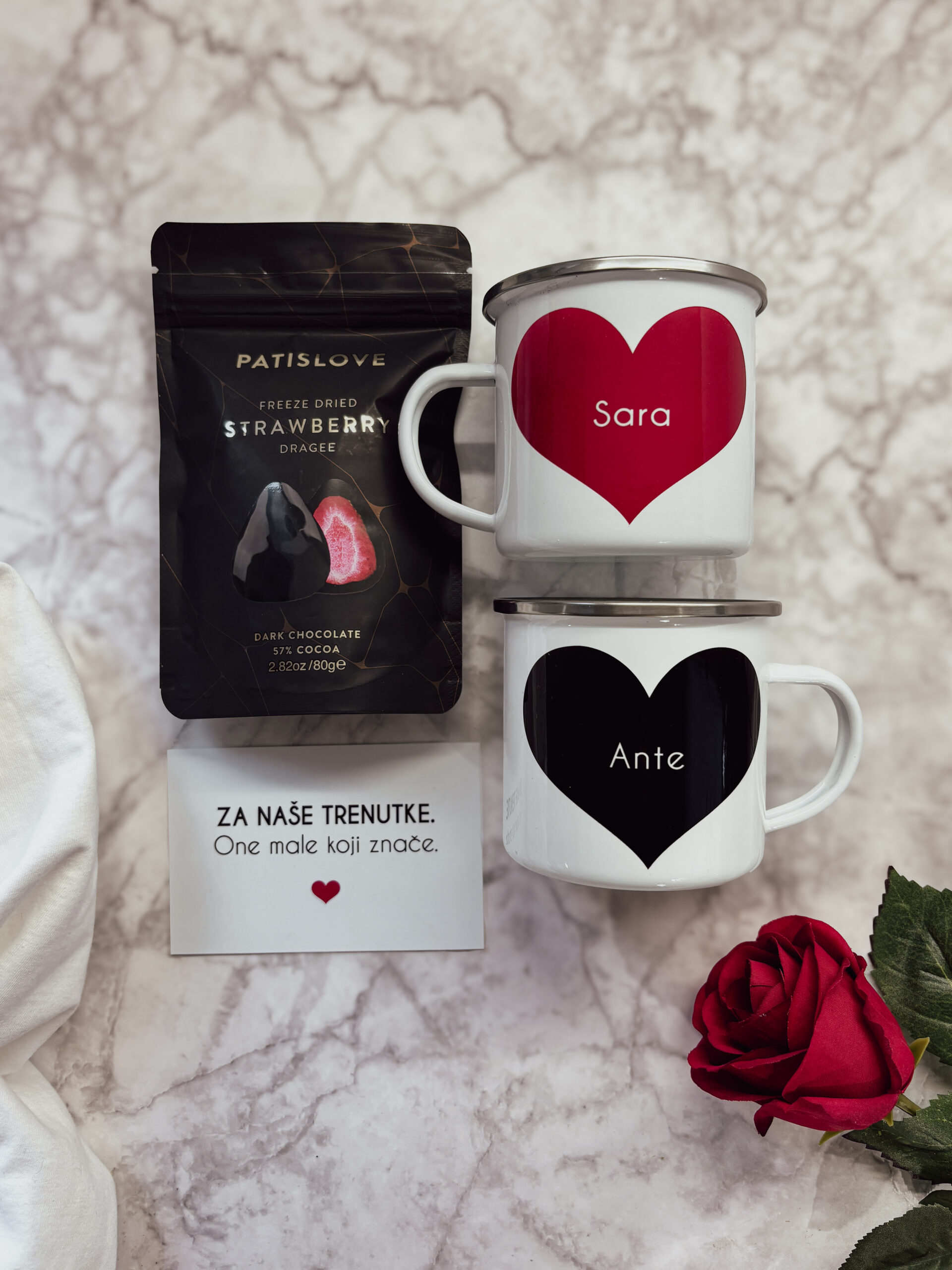 Dva personalizirana emajlirana lončića, premium jagode u tamnoj čokoladi i kartica s porukom – mali ritual za velike trenutke.